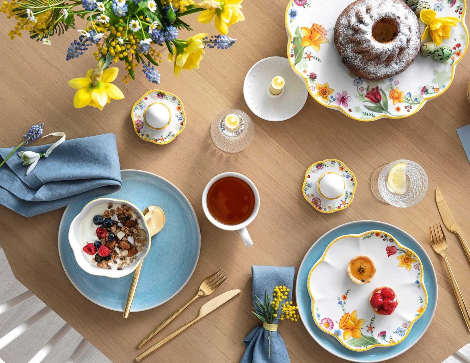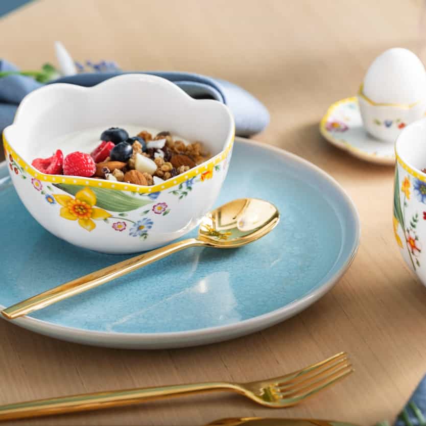 Lasse dich von der Pracht des Frühlings inspirieren und gestalte mit „Spring Awakening“ und „Crafted Blueberry“ einen bezaubernden Ostertisch. Das klassische Geschirr „Spring Awakening“ fängt die Schönheit von Narzissen und Traubenhyazinthen ein, während die modernen Elemente von „Crafted Blueberry“ in zartem Blau harmonische Akzente setzen. Diese Kombination schafft eine festliche und zugleich leichte Atmosphäre, die deine Gäste begeistern wird. Runde das Ensemble mit farblich abgestimmten Servietten und kleinen Dekoelementen ab, um einen perfekt harmonischen Tisch zu gestalten.