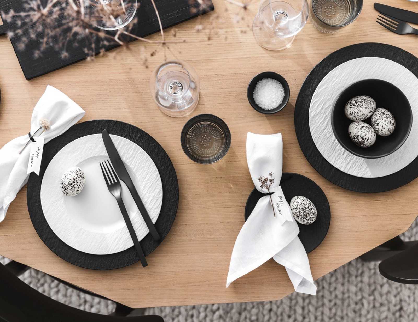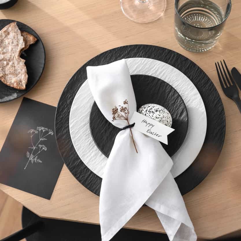 Lust auf eine moderne Tischdekoration zu Ostern? Schaffen eindrucksvolle Kontraste mit schwarzen und weißen Tellern aus unserer Kollektion „Manufacture Rock“. Ein Arrangement aus getrockneten Zweigen und Blumen sowie weiße Stoffservietten runden den Look deines modernen Ostertisches ab. Tipp: Forme die Servietten zu kleinen Ohren.
