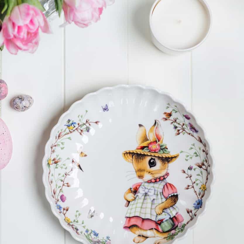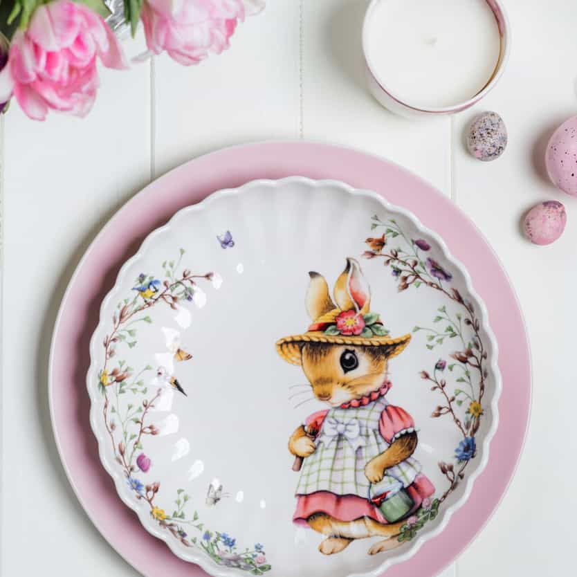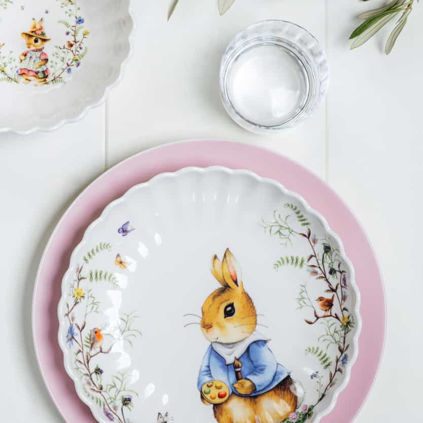 Nicht jeder mag es besonders bunt und verspielt. Aber du möchtest auch nicht ganz auf Ostermotive verzichten? Die fröhlichen, farbenfrohen Hasenmotive der „Spring Fantasy“-Kollektion bilden einen schönen Kontrast zu den zarten Pastelltönen und Blüten. Als Blumendekoration eignen sich Tulpen oder ein Osterzweig mit kleinen Deko-Anhängern.