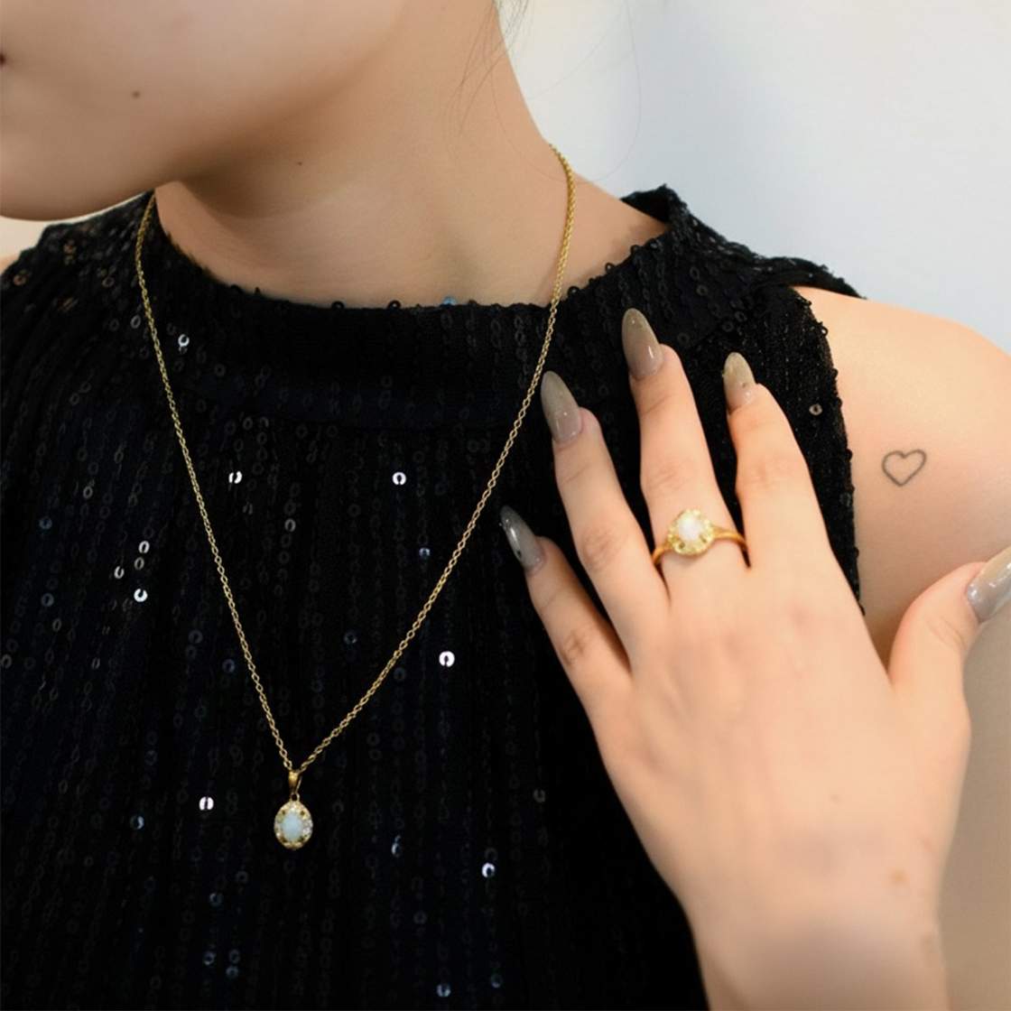 Die handgeschnitzte Schmucklinie besteht aus Sterlingsilber, einer 18-karätigen Vergoldung, handverlesenen äthiopischen Opalsteinen mit wunderschönem Glanz, dekoriert mit weißen Topassteinen. Einzigartiges Design von ARDECO. Erhältlich ab sofort als Ring, Ohrstecker und Collier.