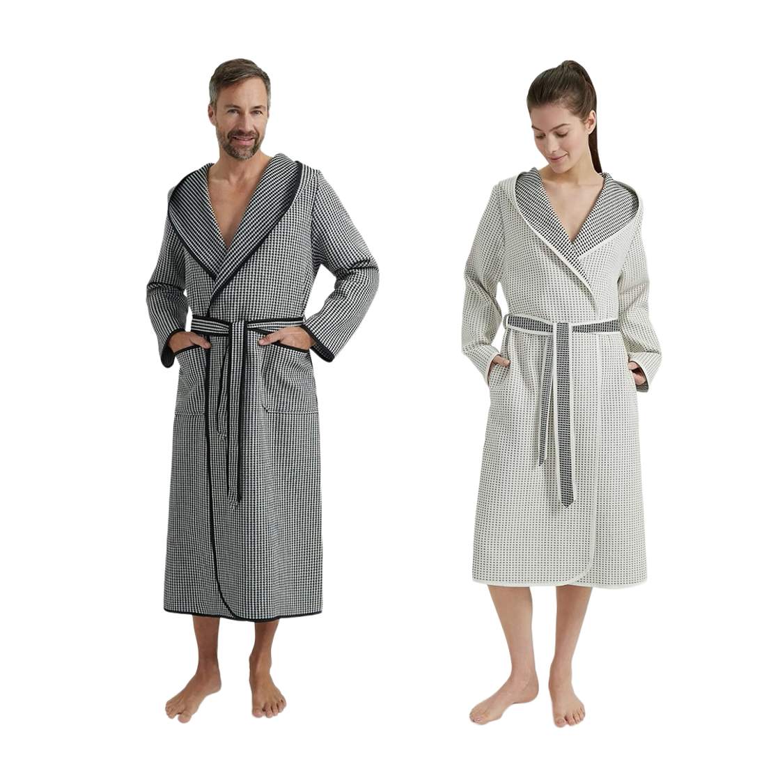 *Leichte Waffel-Piqué-Bademäntel mit Kapuze für Damen und Herren | Schwarz/Natur