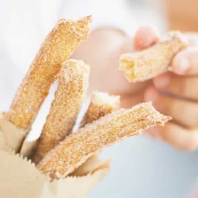 Churros sind ein längliches, karpfenähnliches Spritzgebäck aus Brandteig, das zunächst in Öl goldgelb frittiert und anschließend mit Zucker und verschiedenen Toppings serviert wird.