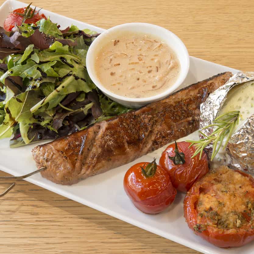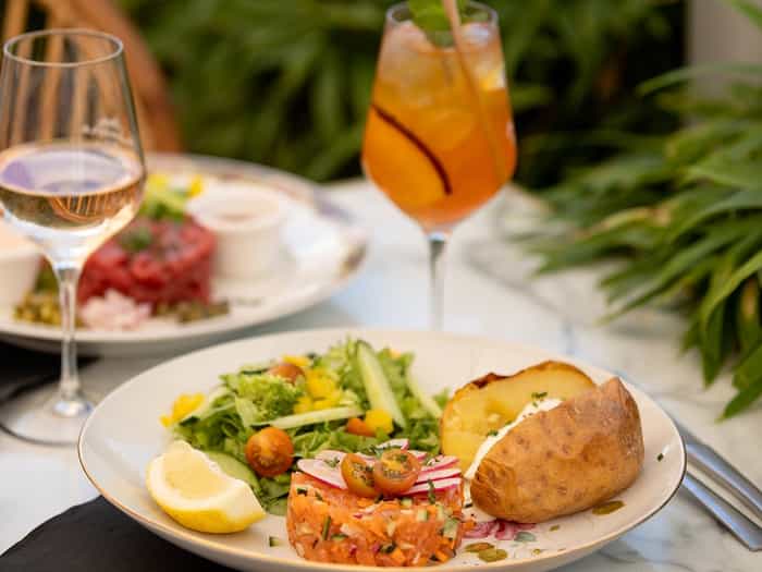 In warmer months, enjoy house-made salmon gravlax with guacamole, strawberry salads, and exquisite desserts crafted by Philippe Urraca, Meilleur Ouvrier de France.