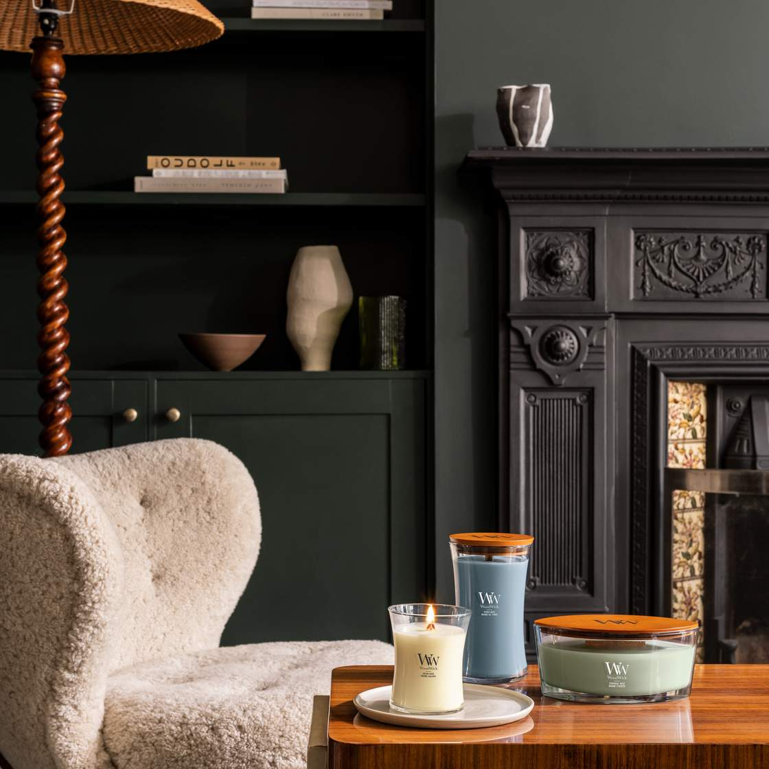 WoodWick candles feature a patented wooden wick that adds a soothing crackling sound.