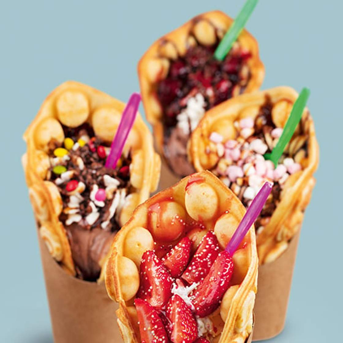 Enjoy our homemade fresh bubble waffles with creative fillings and toppings. For hot days, there are cool-down options like our delicious soft ice cream or cold drinks. Our coffee from Illy will give you power after a long day of shopping day.